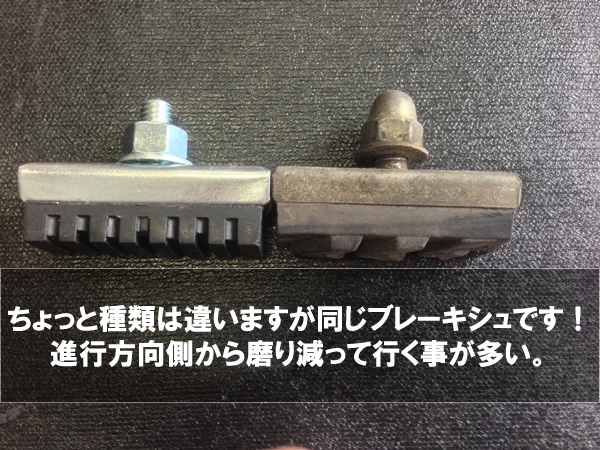 画像のブレーキシュー、右は主にママチャリの前輪ブレーキに使用されているシューなのですが、